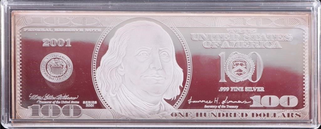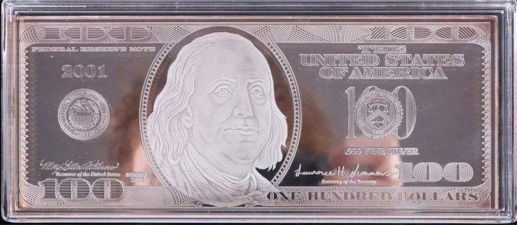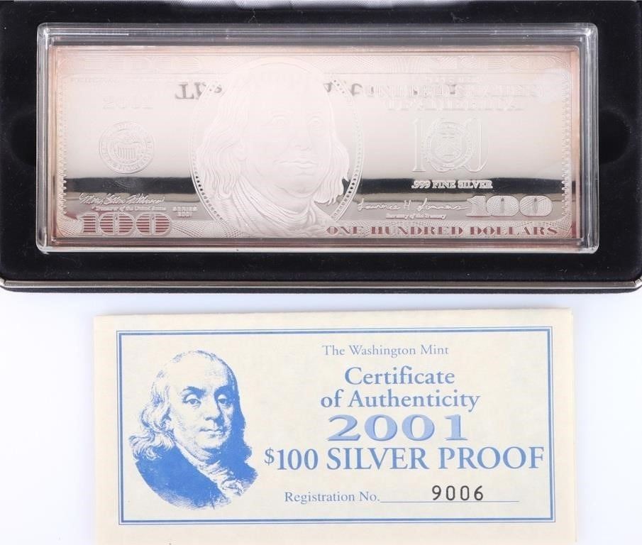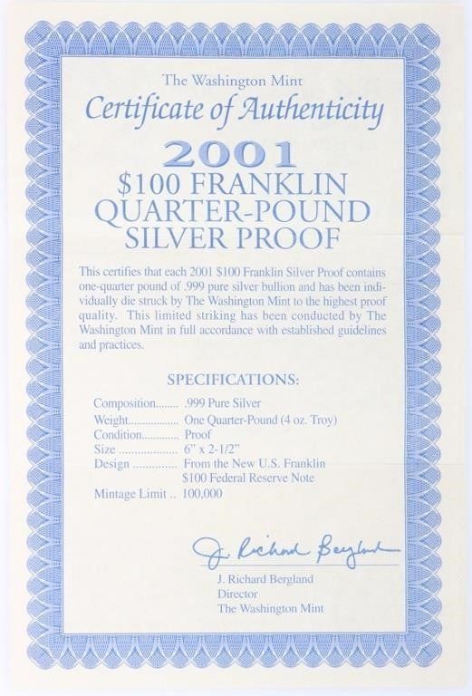 2001 fine silver 4 Troy ounce Proof $100 Bullion with COA.