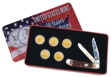 SET INCLUDES ALL FIVE GOLD PLATED STATE QUARTERS AND A COMBINATION KNIFE WITH 2001 MARKED ON BOLSTER, PICTURES OF EACH STATE QUARTER ON THE BLADE, EST. $35.00 TO $45.00