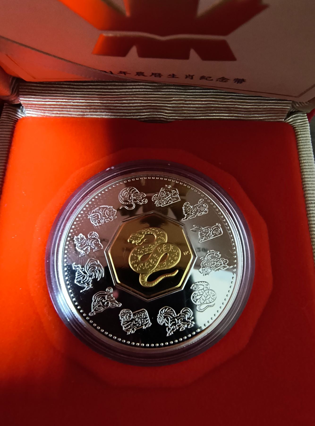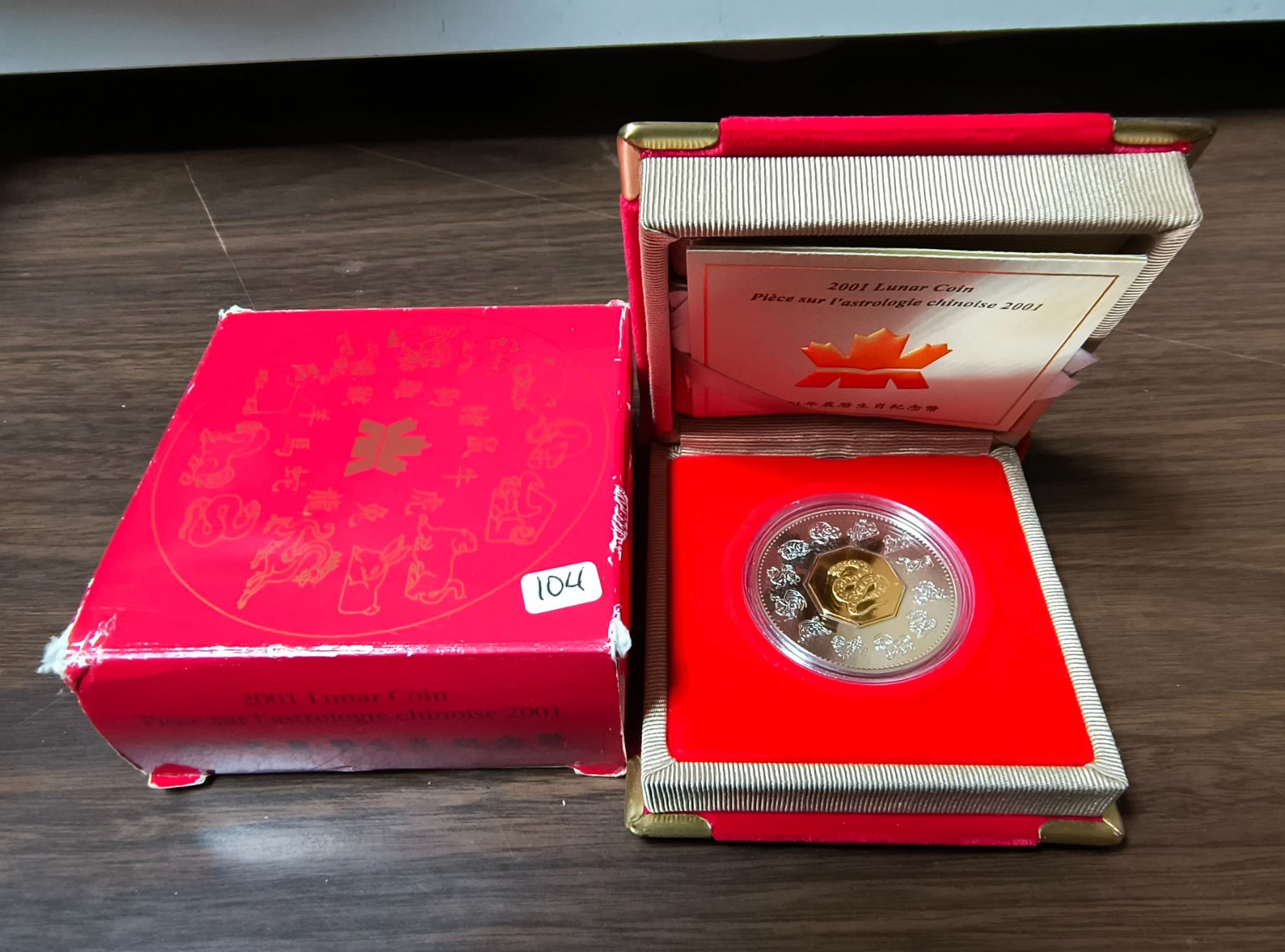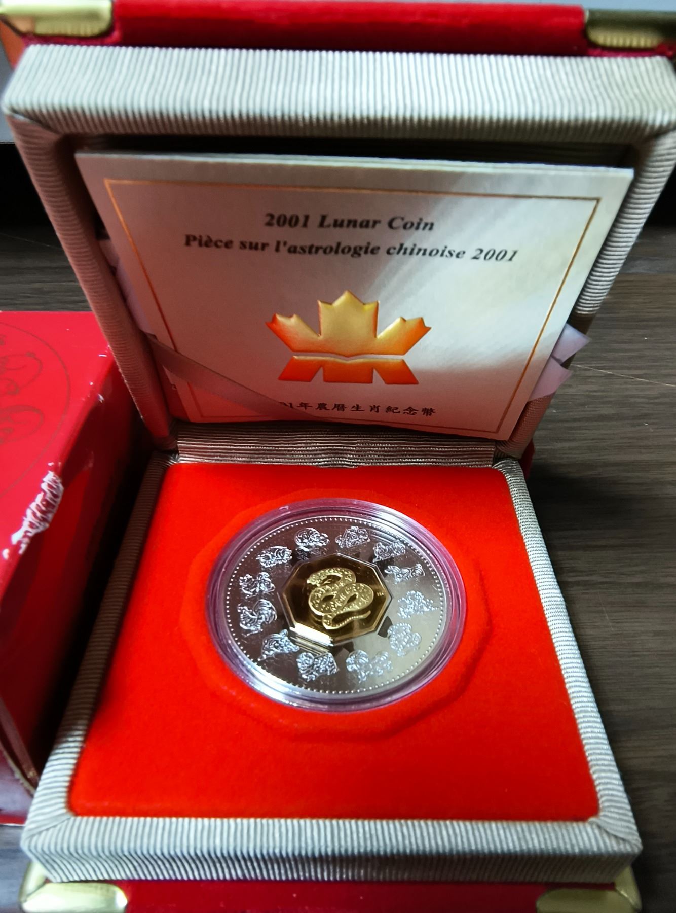 2001 Lunar Calendar Year of the Snake $15. Sterling Silver with 24-karat gold plating on the Snake. Proof with Ultra Heavy Cameo. Housed in its original Royal Canadian Mint case of issue. Includes Certificate of Authenticity.