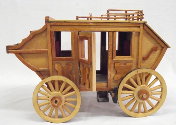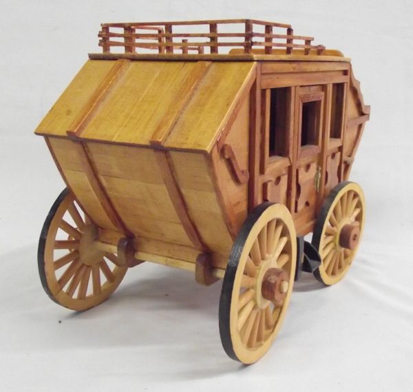 2001 Miniature Wooden Stagecoach by Don Vogle, has hinged doors, top and side has removable lids, does roll, red felt seats, movable hand brake, small piece of wood broken off of front axle and small piece missing off of rack on top, also missing 2 small wooden pieces off of hubs of front wheels, measures approx. 14''L x 10''H x 8''W