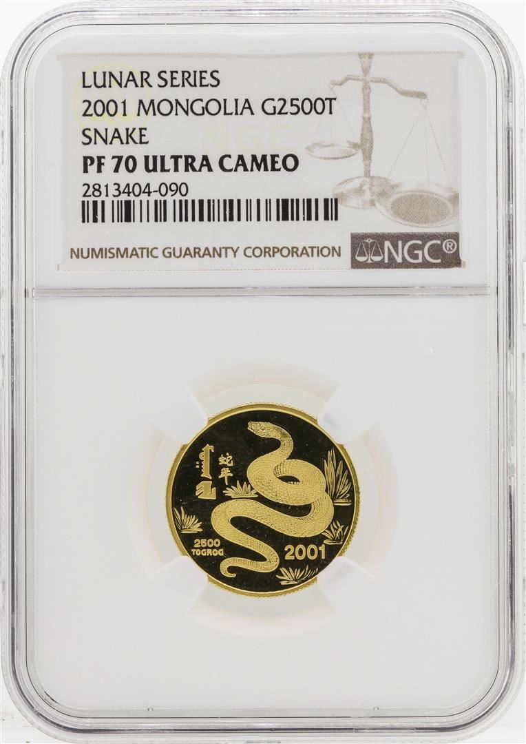 One 2001 Mongolia 2500 Tugrik 1/4 oz. Gold Snake Proof Coin NGC PF70 Ultra Cameo. NGC Certified.