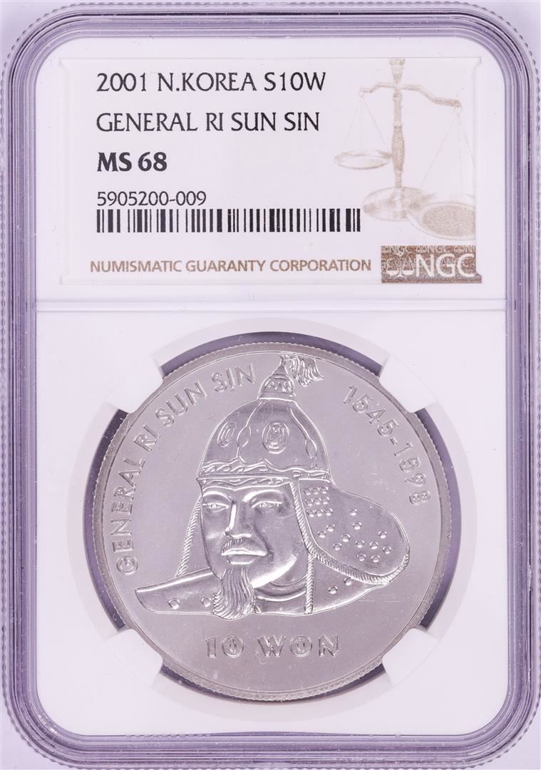 One 2001 N. Korea 10 Won General Ri Sun Sin Silver Coin NGC MS68. NGC Certified.