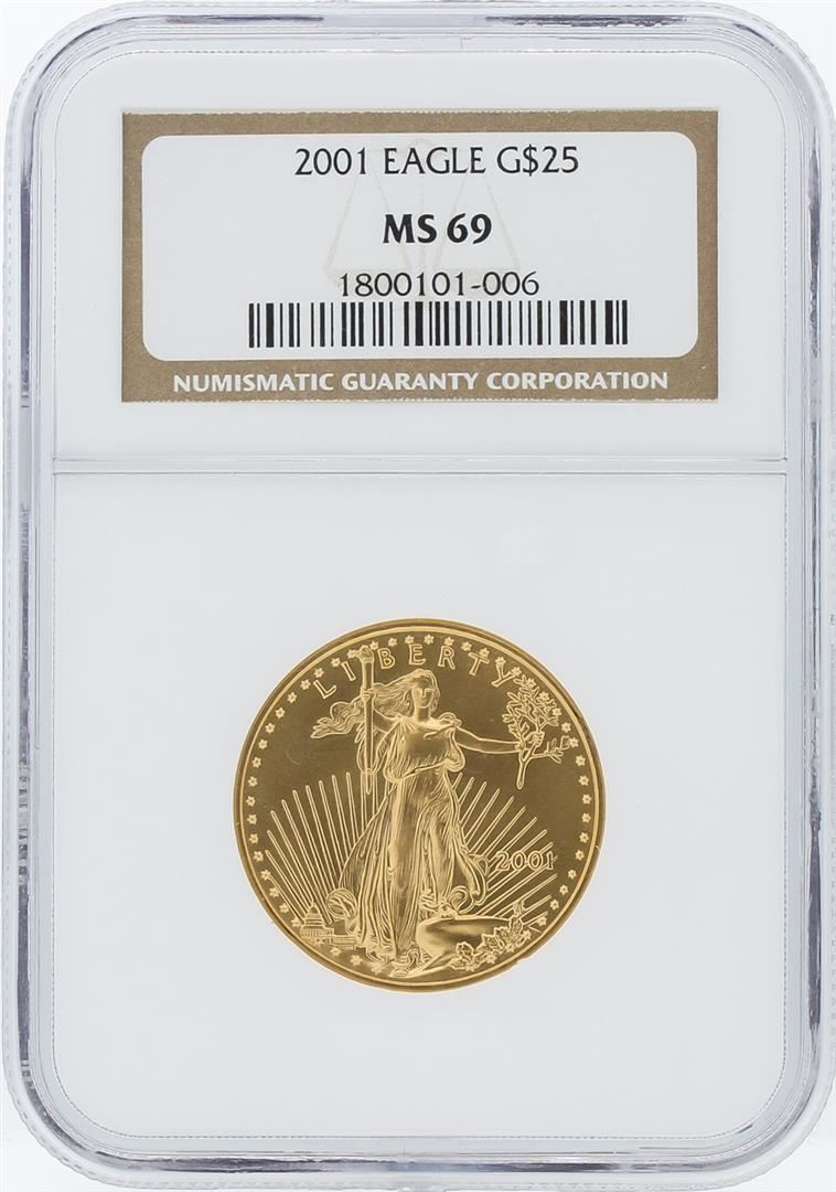 One 2001 NGC MS69 $25 American Eagle 1/2 oz Gold Bullion Coin. NGC Certified.