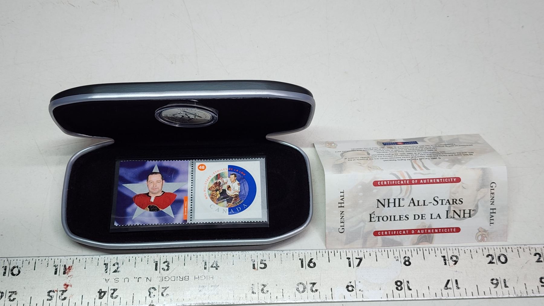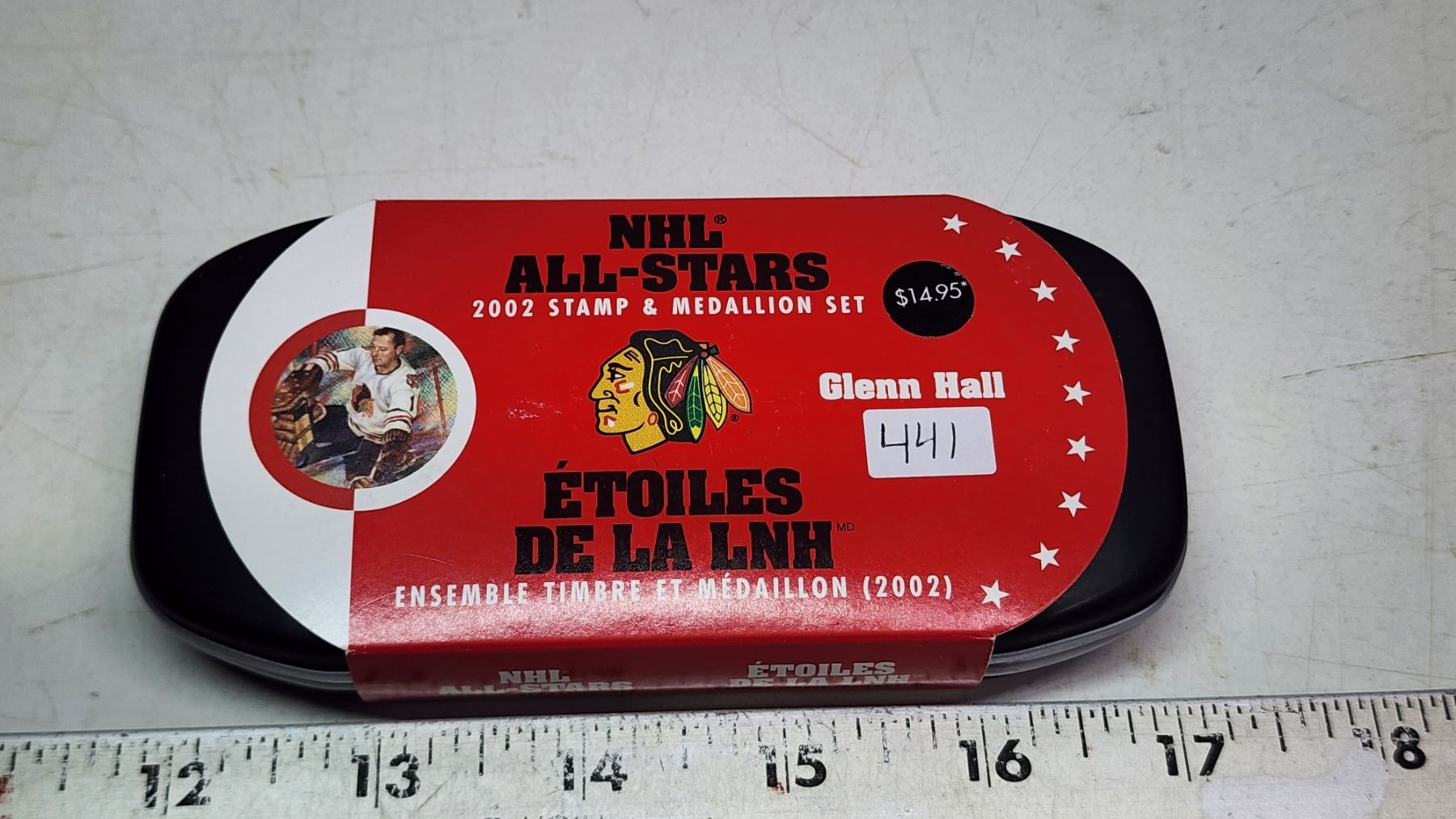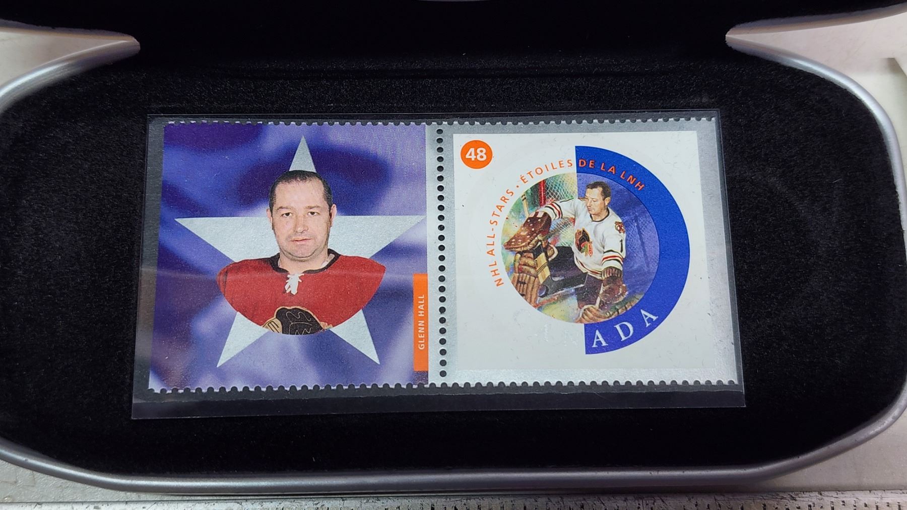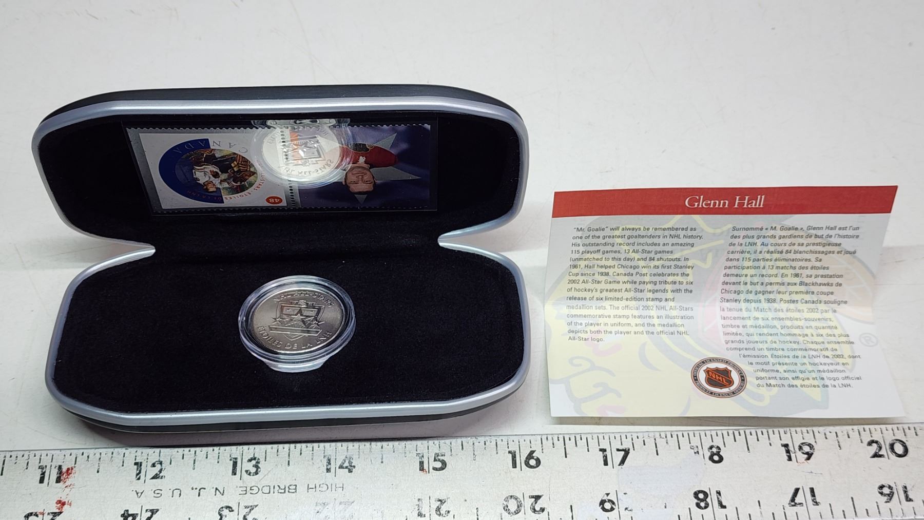 2001 NHL All-Stars Glenn Hall Stamp & Medallion Set. Housed in its original case & box of issue.