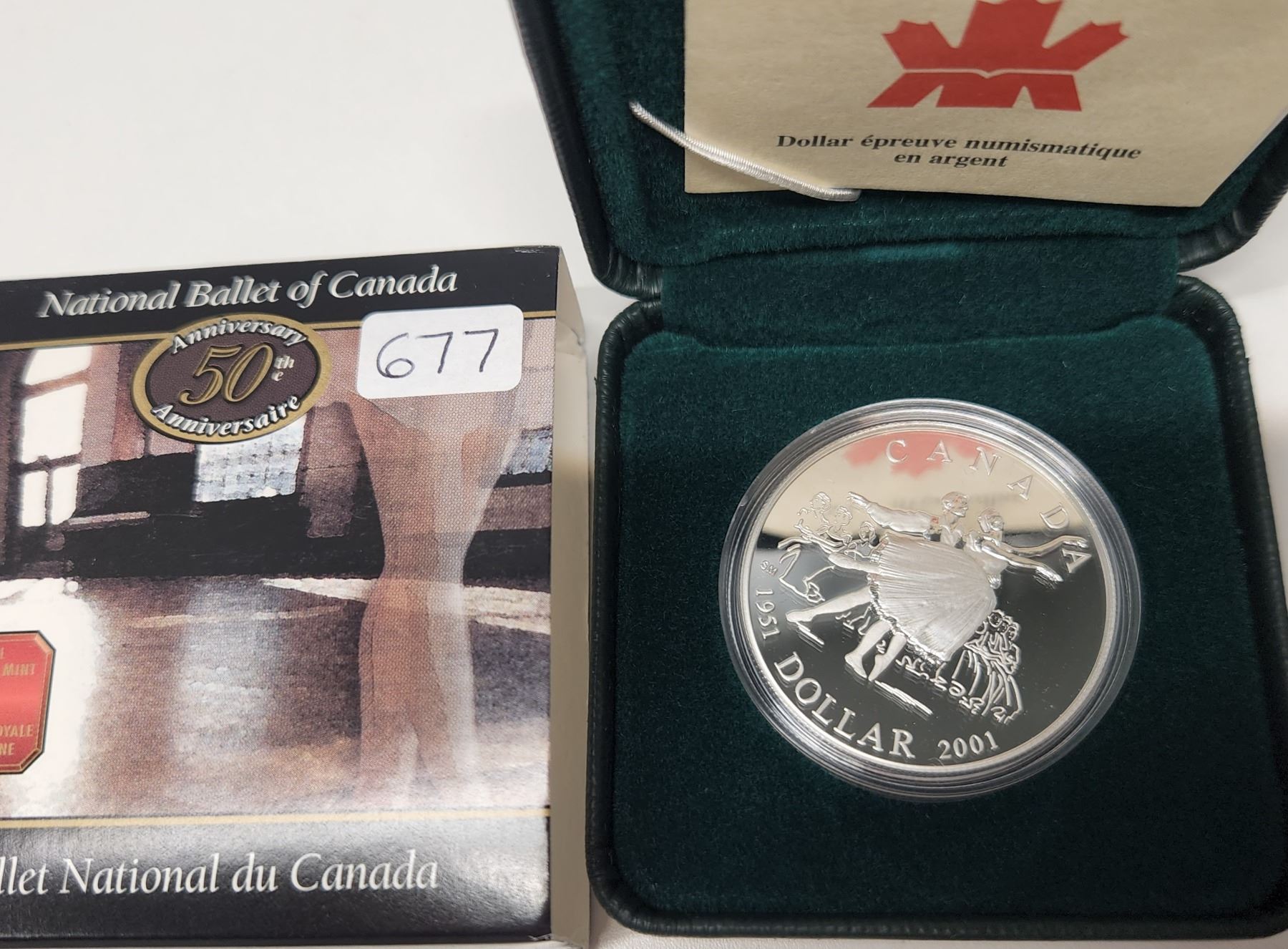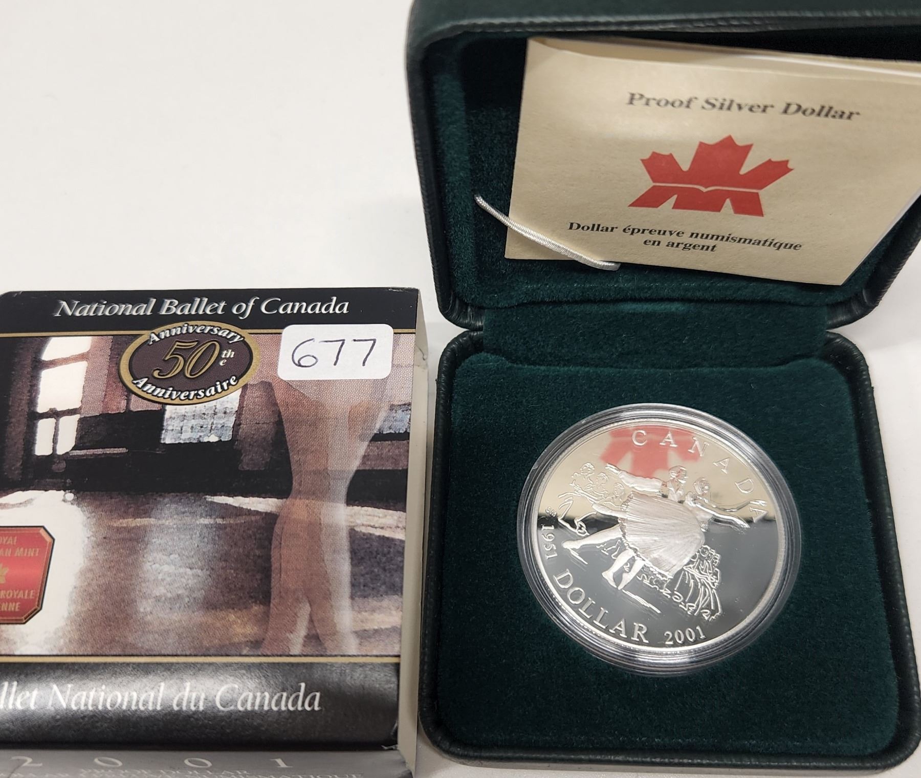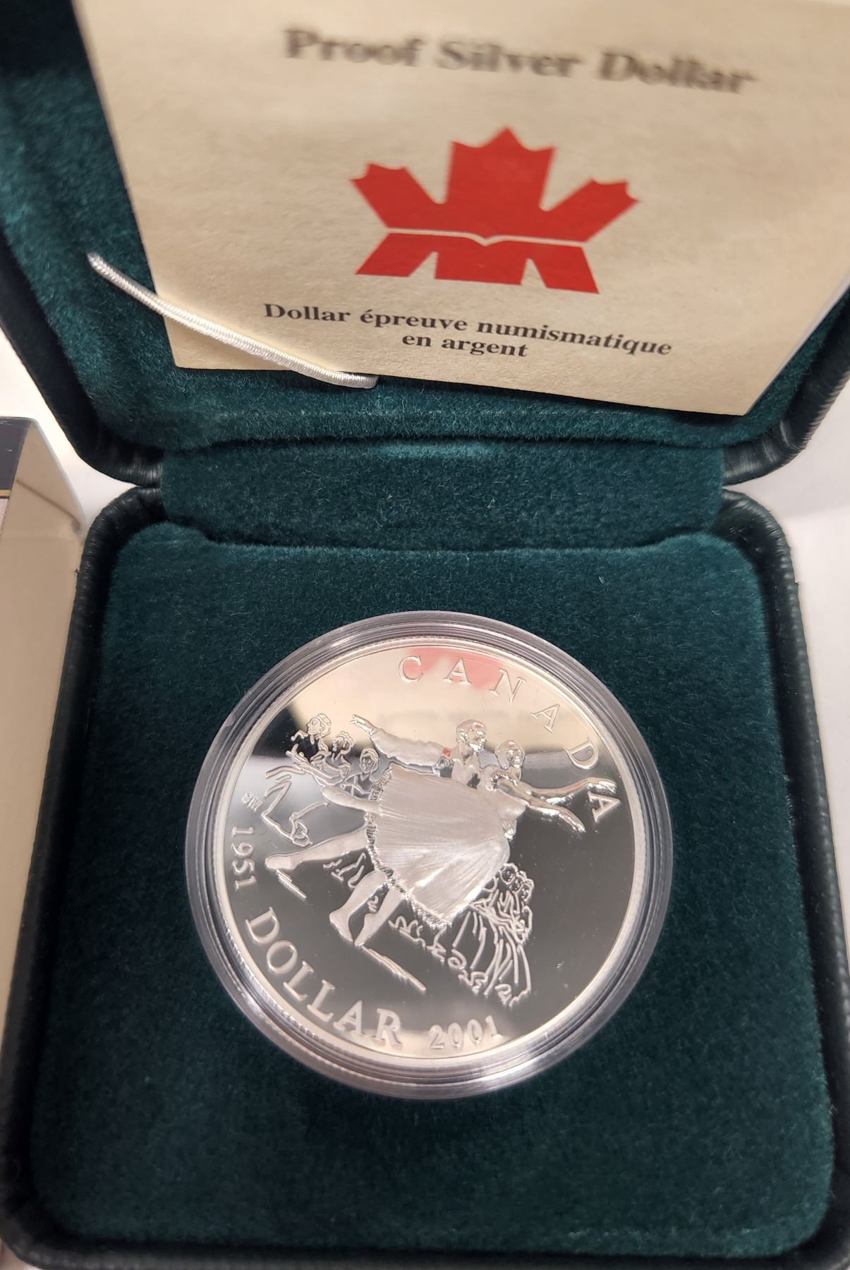 2001 National Ballet Proof Silver Dollar. Commemorates the 50th Anniversary of the National Ballet of Canada. Sterling Silver. Bright White with Ultra Heavy Cameo. In case and box of issue.