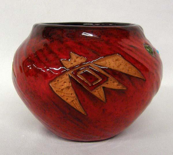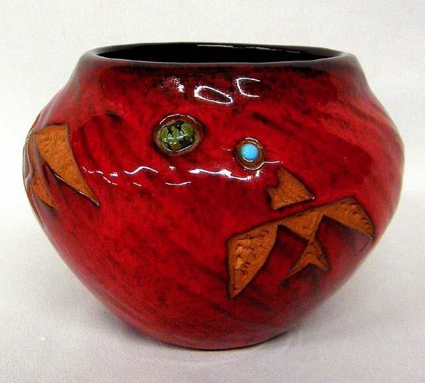 2001 Native American Acoma Glazed and Carved Pot with Turquoise Insets by Award Winning Artist C.M. Chino. Measures approx. 3''Hx4.25''W. Buyers Pay Actual Shipping and Handling Charges(see terms and conditions for more information).