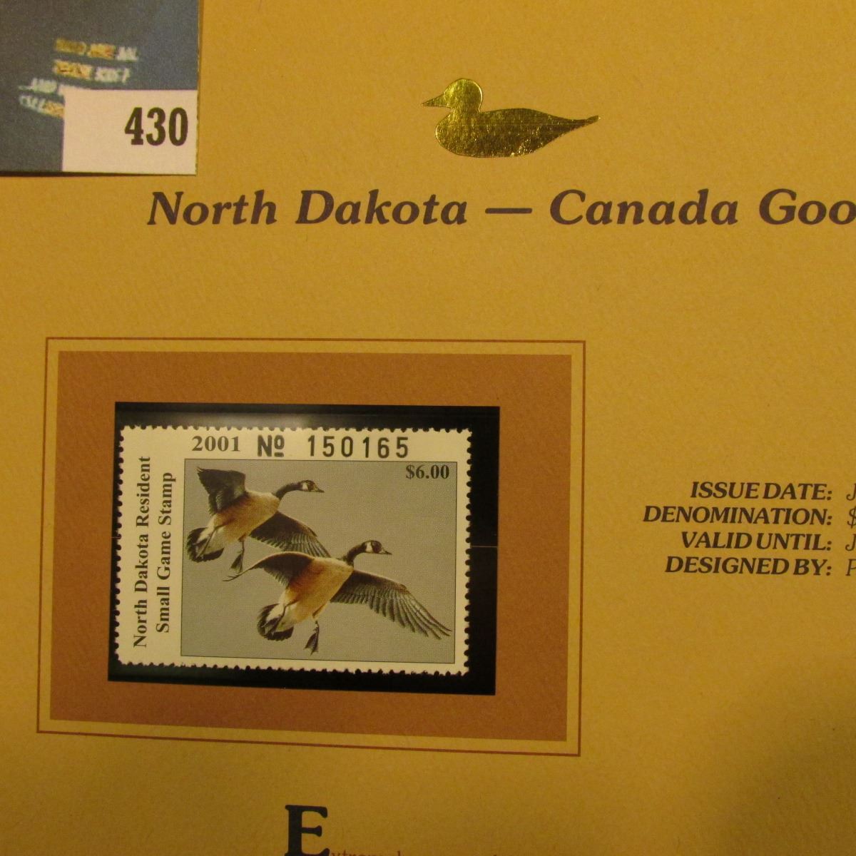 2001 North Dakota Waterfowl $6.00 Stamp depicting a pair of Canada Geese, Mint, unsigned, in vinyl page with literature.