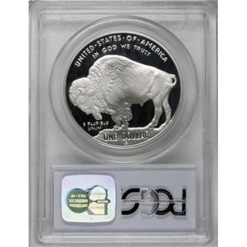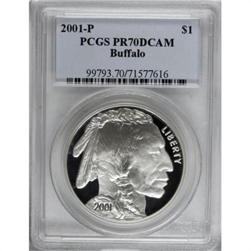 <B>2001-P $1 Buffalo PR70 Deep Cameo PCGS.</B></I> An impressive coin with bright, silky mint luster over the devices that contrasts sharply with the deep mirrors seen in the fields. Brilliant throughout. One of only 99 pieces so graded by PCGS (8/07).<BR><BR><b>Shipping:</b> Coins & Currency (<a target="_blank" href="http://www.heritageauctions.com/common/shipping.php">view shipping information</a>)