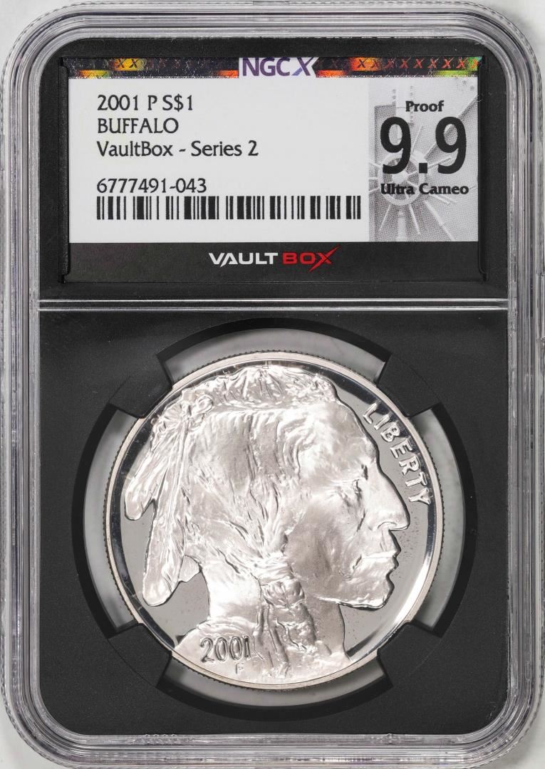 One 2001-P $1 Buffalo Silver Dollar Coin NGCX Proof 9.9 Ultra Cameo VaultBox Series 2. NGC Certified.