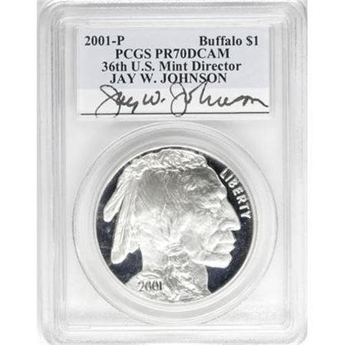 <B>2001-P $1 Buffalo Silver Dollar PR70 Deep Cameo PCGS.</B></I> A fully brilliant, untoned, proof with immaculate surfaces. The PCGS holder is signed by former Mint Director Jay Johnson.<BR><BR><b>Shipping:</b> Coins & Currency (<a target="_blank" href="http://www.heritageauctions.com/common/shipping.php">view shipping information</a>)