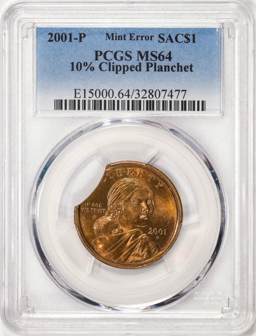 2001-P $1 Sacagawea Dollar Coin 10% Clipped Planchet PCGS Mint Error MS64