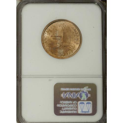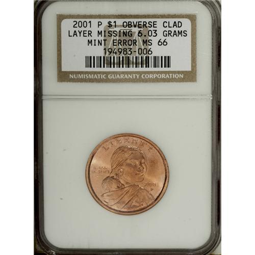 <B>2001-P $1 Sacagawea Dollar--Obverse Clad Layer Missing--MS66 NGC.</B></I> 6.03 gm. A normal Sacagawea dollar weighs 8.1 grams. One of the two outer clad layers separated (or more likely, was never present) prior to the strike, and the obverse die struck the copper core. The reverse has a normal golden appearance. Despite the underweight planchet, the strike is sharp except on STATES OF.<BR><BR><b>Shipping:</b> Coins & Currency (<a target="_blank" href="http://www.heritageauctions.com/common/shipping.php">view shipping information</a>)
