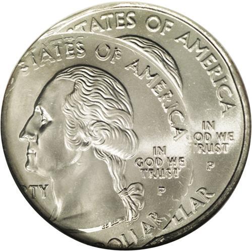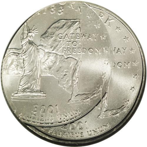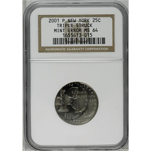 <B>2001-P<25C> New York Statehood Quarter--Triple Struck--MS64 NGC.</B></I> The first strike was normally centered while the second and third strikes closely overlap, each about 30% off-center at 8 o'clock. Fully brilliant and lustrous with light nickel-gray color and hints of pale gold toning.