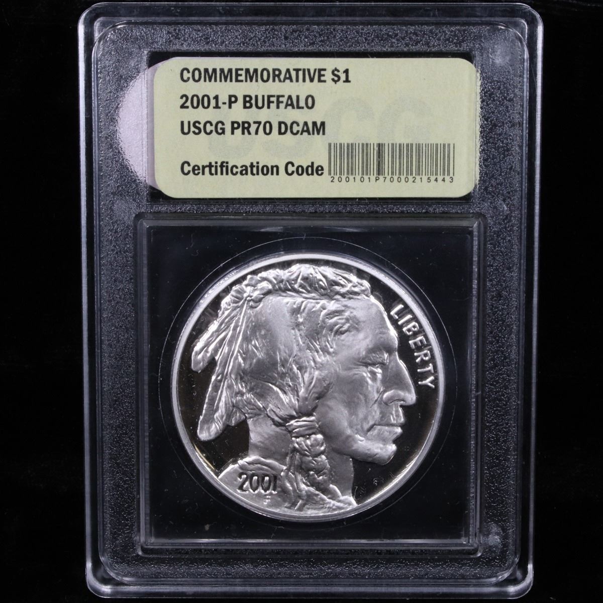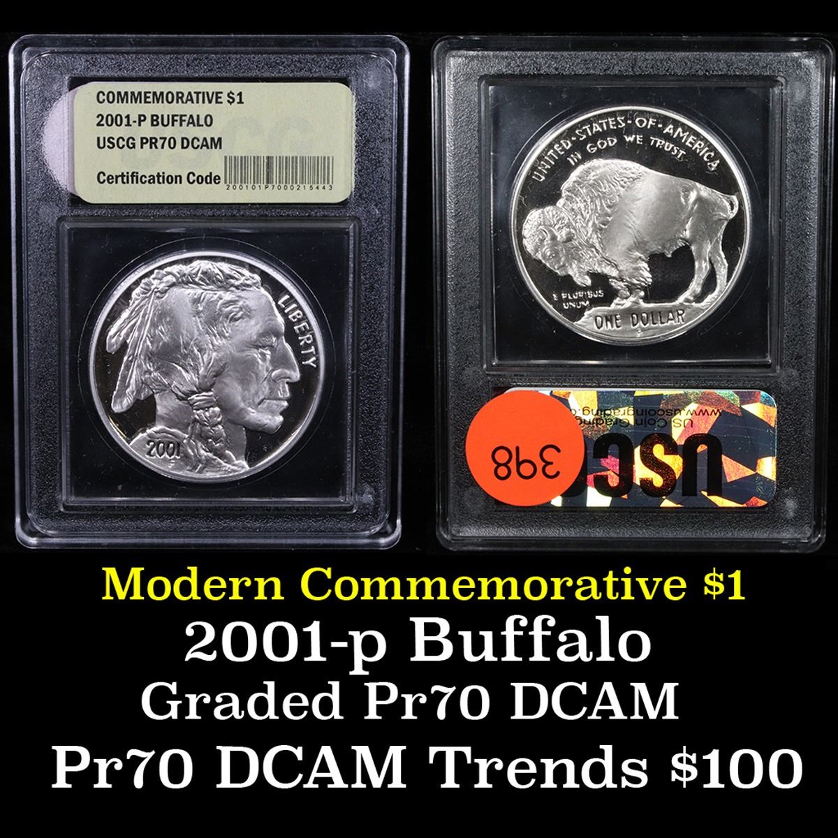 2001-P Buffalo . . Modern Commem Dollar $1 Grades GEM++ Proof Deep Cameo. The 2001 American Buffalo Silver Dollar was issued to commemorate the recently opened National Museum of the American Indian (NMAI) of the Smithsonian Institution. The classic design of the coin after James Earle Fraser's Buffalo Nickel, made this commemorative coin issue immensely popular with collectors, leading to a prompt sell out. PCGS lists PR70 DCAM at $1100 This example is graded perfection PR70 DCAM by USCG. Estimated Value $350