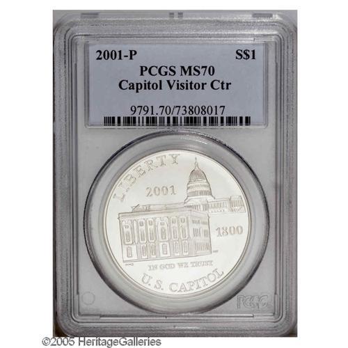 <B>2001-P<S$1> Capitol Visitor's Center Silver Dollar MS70 PCGS.</B></I> A crisply struck, pristine example of this lovely commemorative. The matte-like surfaces have a very pleasing sheen. Population: 16 in MS70 (12/05).