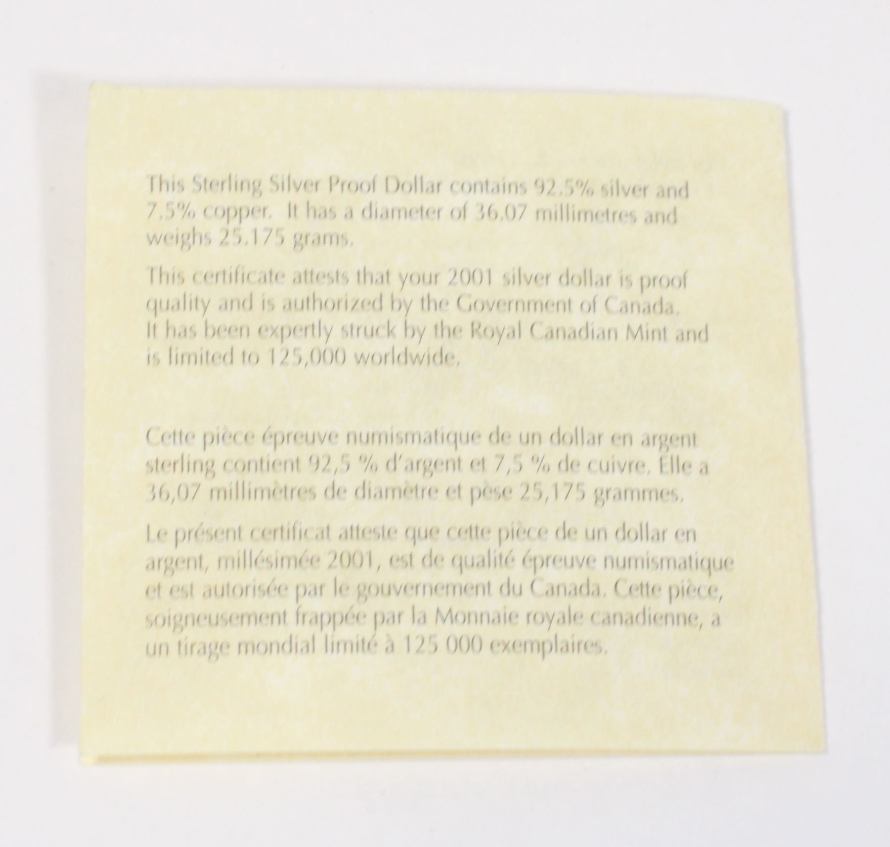 2001 ROYAL CANADIAN MINT PROOF SILVER DOLLAR
