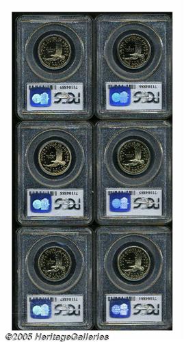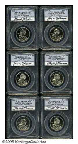 <B>2001-S<$1> Sacagawea PR69 Deep Cameo PCGS.</B></I> Six examples. All of the PCGS holders are signed by Jay W. Johnson, as "36th U.S. Mint Director", and are designated as #1 through #6 of 5000. The six coins are fully struck and essentially pristine, as expected.