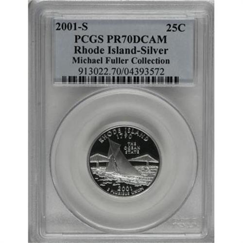 <B>2001-S 25C Rhode Island Silver PR70 Deep Cameo PCGS.</B></I> This is a fully struck, pristine example of the Rhode Island Statehood quarter. Intense white-on-black contrast occurs between frosted devices and deeply reflective fields. Population: 43 in 70 Deep Cameo (10/07). <BR><I>From The Michael Fuller Collection.</B></I><BR><BR><b>Shipping:</b> Coins & Currency (<a target="_blank" href="http://www.heritageauctions.com/common/shipping.php">view shipping information</a>)