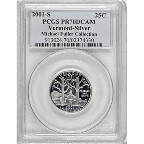 <B>2001-S 25C Vermont Silver PR70 Deep Cameo PCGS.</B></I> Michael Fuller Collection. PCGS Population (47/0). NGC Census: (0/0). Numismedia Wsl. Price for NGC/PCGS coin in PR70: $120. (#913024)<BR><BR><b>Shipping:</b> Coins & Currency (<a target="_blank" href="http://www.heritageauctions.com/common/shipping.php">view shipping information</a>)