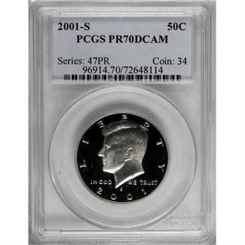 <B>2001-S 50C Clad PR70 Deep Cameo PCGS.</B></I> Stunning white-on-black contrast shows up on both sides of this Deep Cameo. Some faint marks are noted to the left of the olive branch. Population: 12 in 70 Deep Cameo (8/07).<BR><BR><b>Shipping:</b> Coins & Currency (<a target="_blank" href="http://www.heritageauctions.com/common/shipping.php">view shipping information</a>)