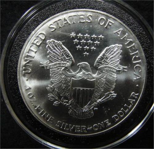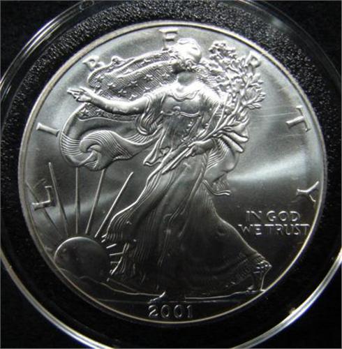 2001 AMERICAN EAGLE SILVER DOLLAR. Coin is in circular case.