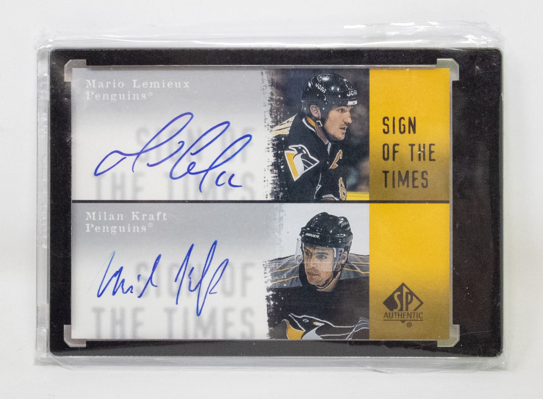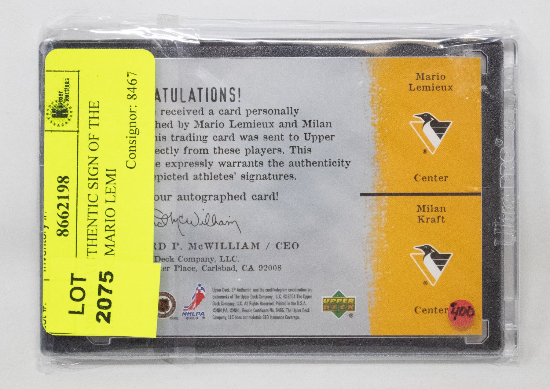 MARIO LEMIEUX AND MILAN KRAFT DUAL SIGNED THIS WITH ON-CARD AUTOGRAPHS CERTIFIED BY UPPER DECK. WHATS UNIQUE ABOUT THIS CARD, IS THAT IN THE BECKETT, I COULDN?T FIND IT?TWO PLAYER CARDS WERE NUMBERED TO /150, AND U DON?T SEE THAT ON THE CARD