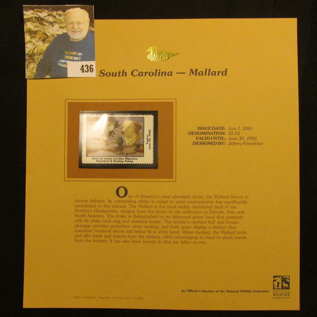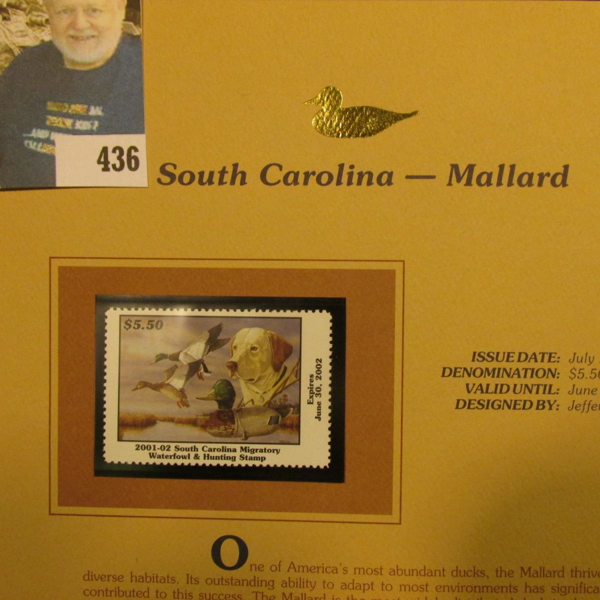 2001 South Carolina Waterfowl $5.50 Stamp depicting a pair of Mallard Ducks, Decoy, and Dog, Mint, unsigned, in vinyl page with literature.