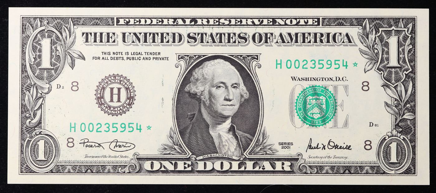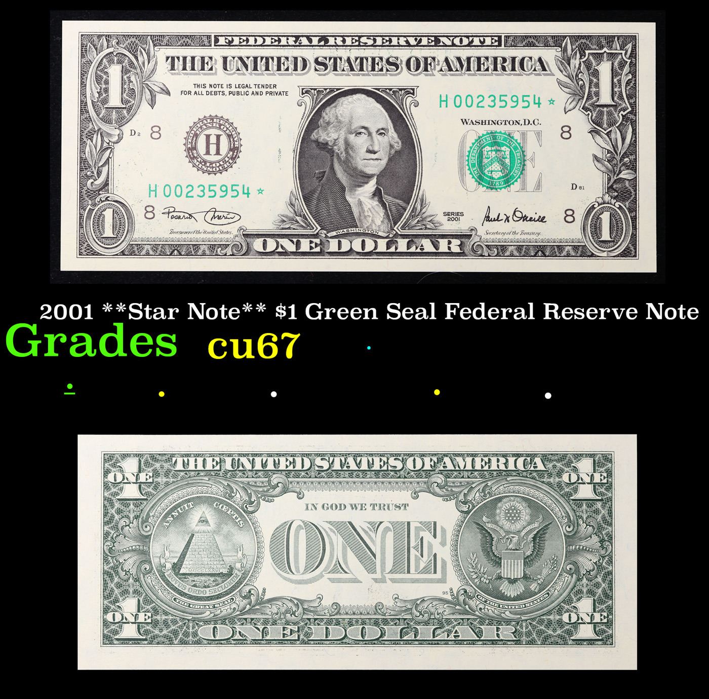 2001 **Star Note** $1 Green Seal Federal Reserve Note Grades Gem++ CU. When notes are discovered that have been printed incorrectly (such as having the serial numbers upside down, etc.) the misprinted "error notes" are replaced with star notes because no two bills within a certain series can be produced with the same serial number. They are used to maintain a correct count of notes in a serial number run. By their nature, star notes are more scarce than notes with standard serial numbers and as such are widely collected by numismatists. Some of the highest prices paid for modern (post-1928) U.S. banknotes have been for star notes. The note itself is a Silver Certificate. Silver Certificates were redeemable in Silver. One of their most distinctive qualities is the blue Treasury seal and serial numbers. These notes include an additional legend printed on the face that is not present on any other Federal Reserve notes. The legend states that Silver had been deposited in the Treasury and was payable on demand to the note’s bearer.