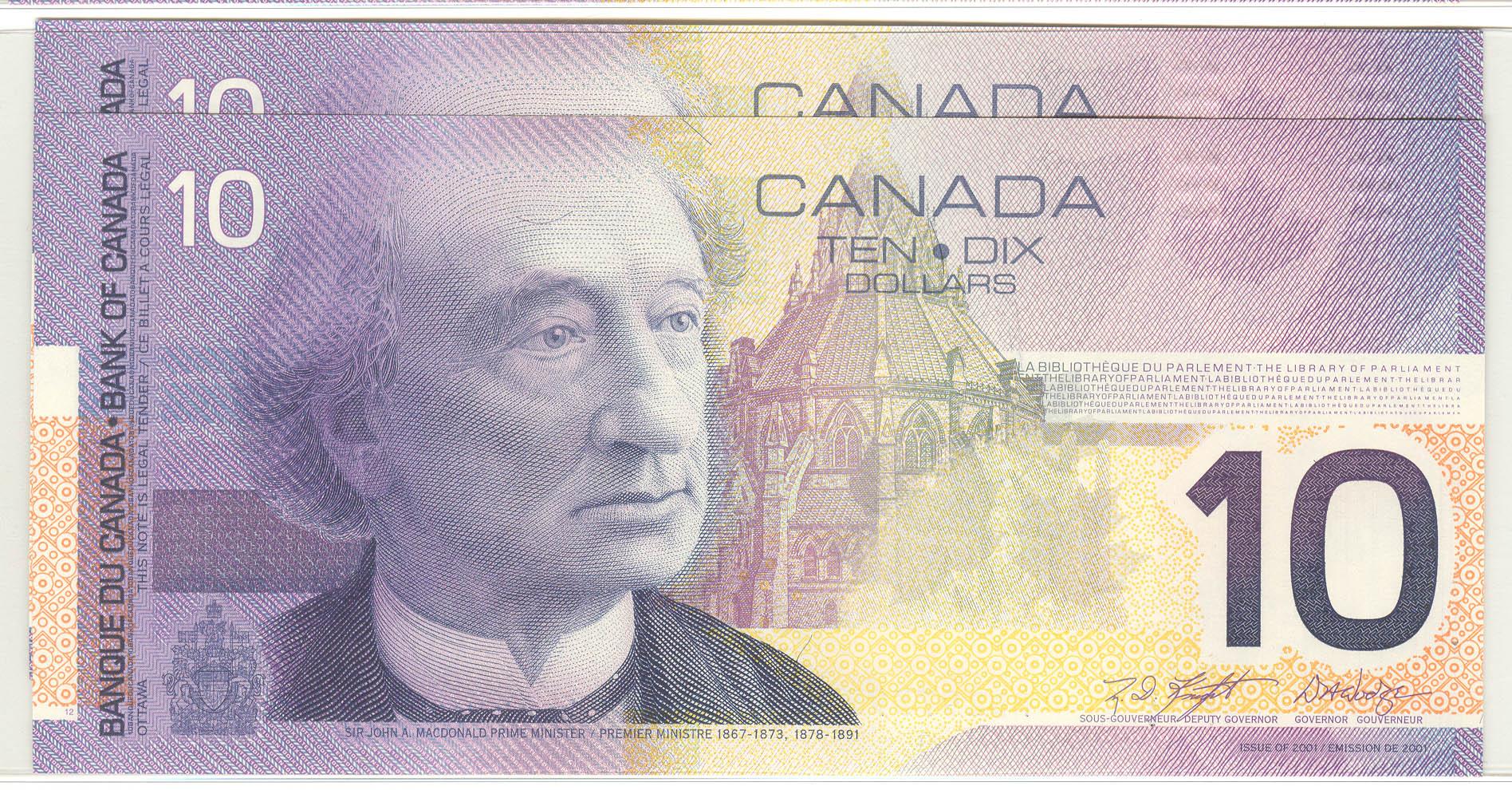 2001 Ten Dollars, BC-63b, 2 consecutive GEM UNC, Knight Dodge, serial FDZ9739597-98.