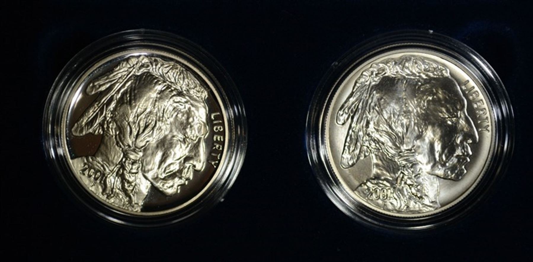 2001 Two Piece Buffalo Silver Dollar Set in Original Packaging. Includes One 2001-P Proof Silver Dollar and One 2001-D Uncirculated Silver Dollar. ESTIMATE $250 - $275.