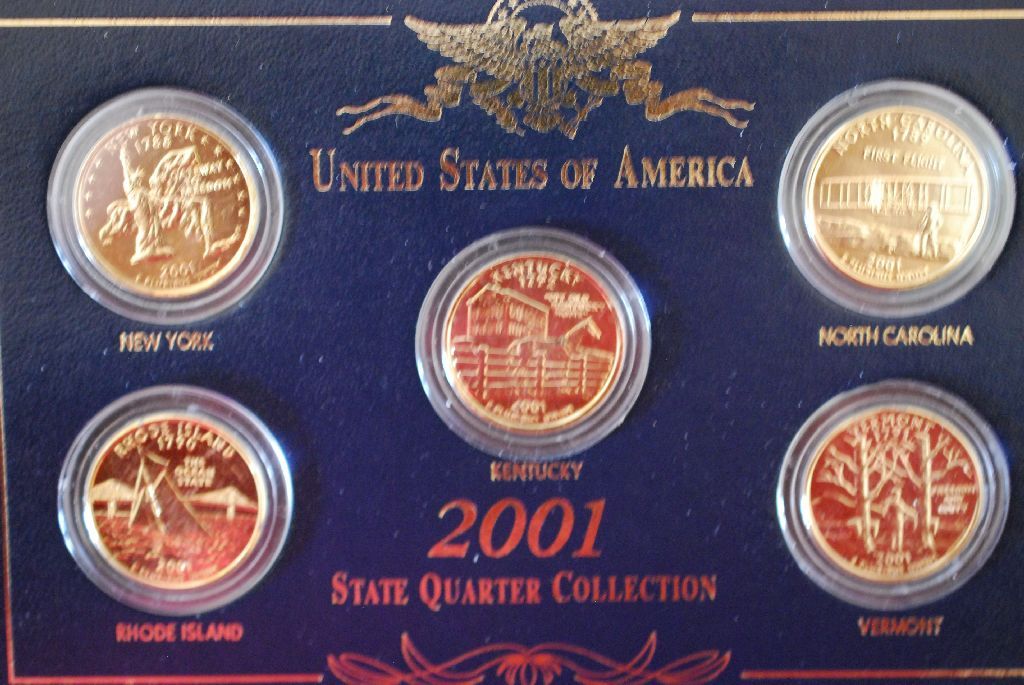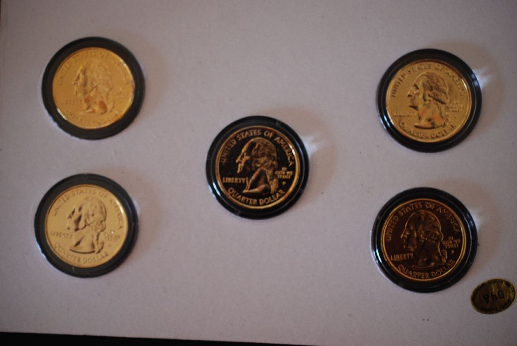 2001 US Gold Plated State Quarter Coin Set In Display Box; Lot of 5 Coins; EST. $5-10
