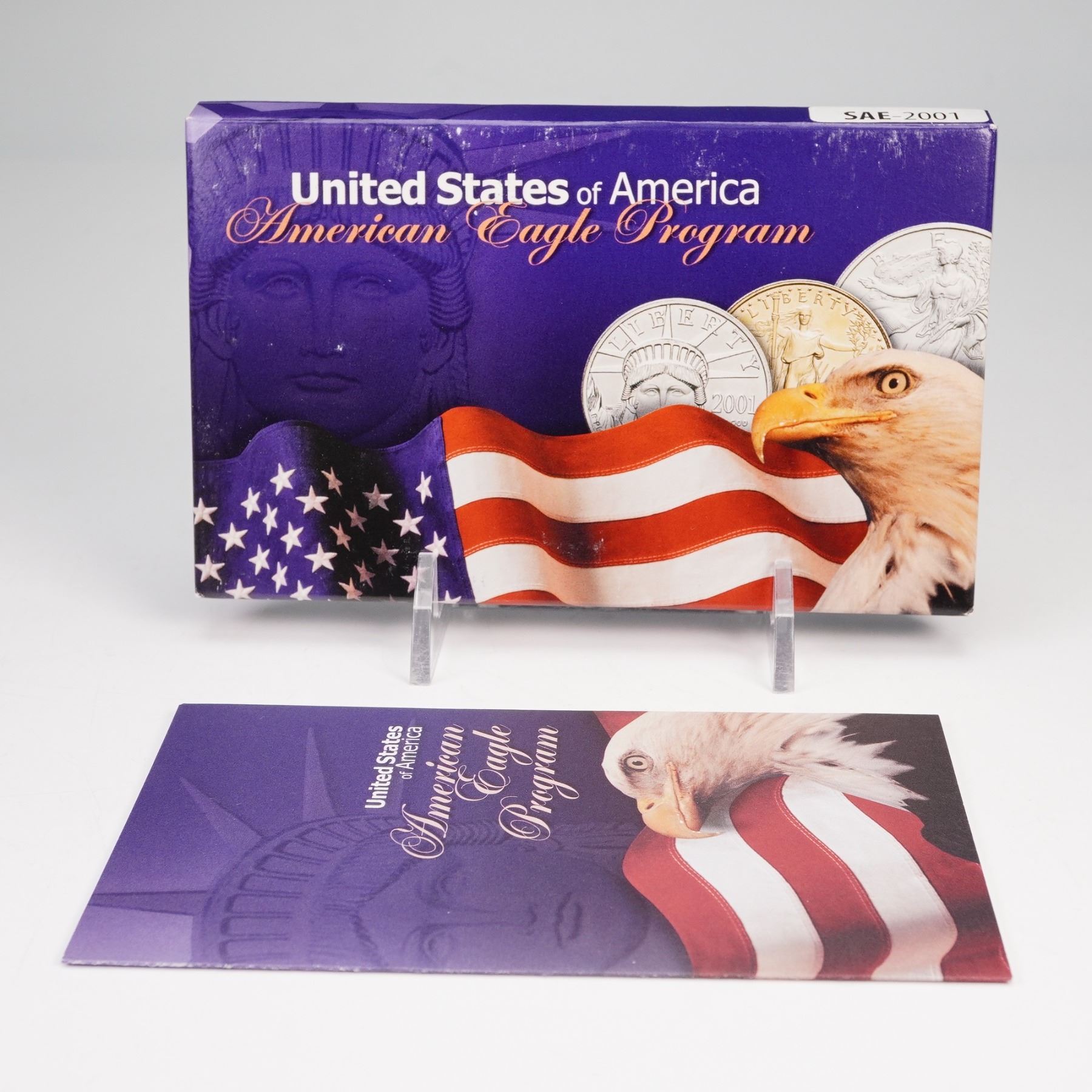 The 2001 Silver American Eagle Type 1 Dollar is the 16th issue from the annual American Silver Eagle program by the U.S. Mint, struck in .999 fine silver and showcasing one of the most iconic designs in American coinage. The obverse features Adolph A. Weinman's timeless image of Lady Liberty draped in the American flag, striding forward as the sun rises over a ridge, while the reverse presents the heraldic eagle beneath 13 stars representing the original colonies. This example is offered in its original U.S. Mint packaging complete with display case and certificate, enhancing both its collectability and bullion appeal.