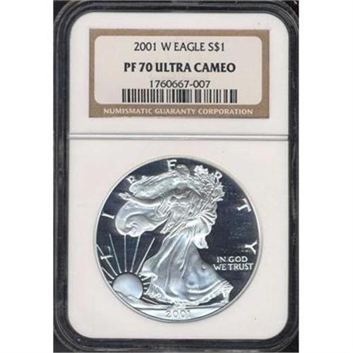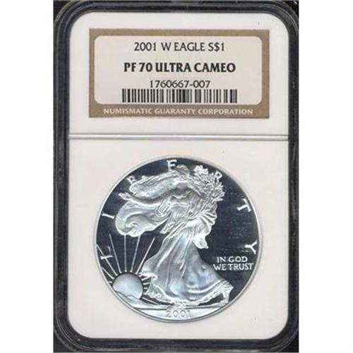 <b>2001-W. $1 Silver Eagle. NGC graded PF70 UC.</b> A lustrous example that has rich frosty white luster on the devices, and perfect deep mirror fields without hairlines or spotting. A dazzler <b>(PCGS # 99954)</b>