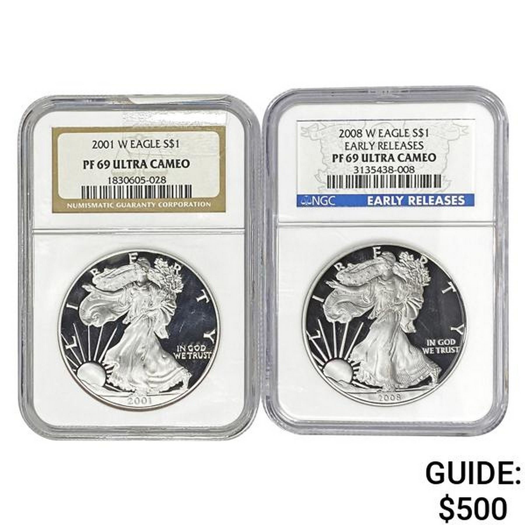 2001-W / 2008-W Eagle $1 NGC PF69 Ultra Cameo [2 Coins]