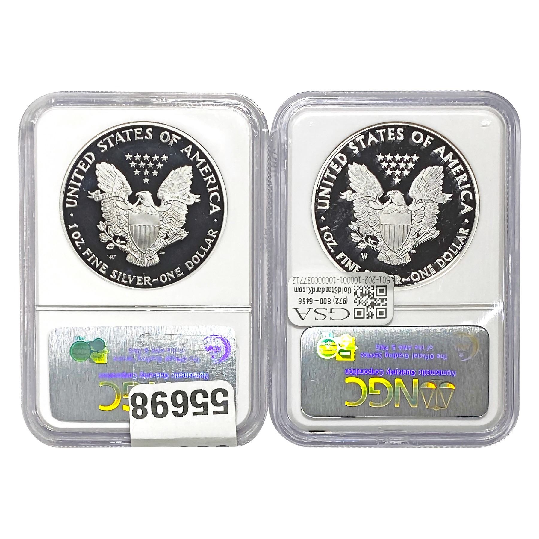 e. Coins sold referencing a third-party grading service are sold “AS IS” without any express or implied warranty, except for a guarantee by GSA that they are genuine. Removal or alteration of the holder, voids all of Bidder’s claims concerning that Product. Certain warranties may be available from the grading services and Bidders are referred to them for further details: Numismatic Guaranty Corporation (NGC), PO Box 4776, Sarasota, FL 34230, www.ngccoin.com/services/writtenguarantee.asp; Professional Coin Grading Services (PCGS), PO Box 9458, Newport Beach, CA 92658, www.pcgs.com/guarantee.html; ANACS, 6555 S. Kenton St., Ste. 303, Englewood, CO 80111; and Independent Coin Grading Co. (ICG), 7901 East Bellview, Ave., Suite 50, Englewood, CO 80111.