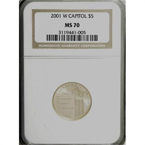 <B>2001-W $5 Capitol Visitor's Center Half Eagle MS70 NGC.</B></I> A technically perfect representative of this modern half eagle commemorative, decisively struck with smoothly lustrous butter-yellow surfaces. The issue with Mint State finish consists of just 6,761 pieces.<BR><BR><b>Shipping:</b> Coins & Currency (<a target="_blank" href="http://www.heritageauctions.com/common/shipping.php">view shipping information</a>)