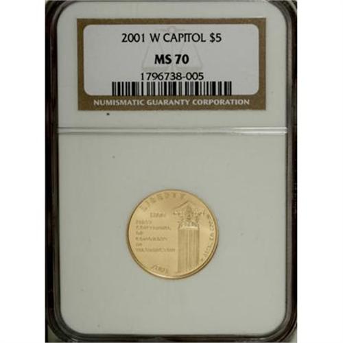 <B>2001-W $5 Capitol Visitor's Center Half Eagle MS70 NGC.</B></I> A shining and technically perfect representative of this turn-of-the-century circulation-finish modern commemorative issue, boldly impressed with immaculate surfaces. The motifs were created by Elizabeth Jones, who received her first commemorative design credit in more than a decade.<BR><BR><b>Shipping:</b> Coins & Currency (<a target="_blank" href="http://www.heritageauctions.com/common/shipping.php">view shipping information</a>)