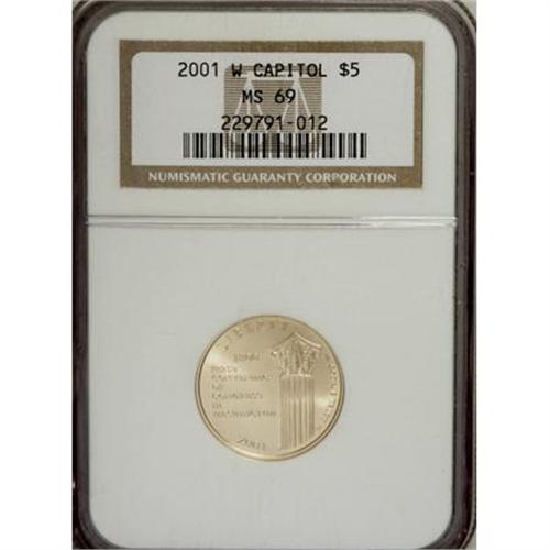 <B>2001-W $5 Capitol Visitor's Center Half Eagle MS69 NGC.</B></I> Decisively struck and shining with satiny and virtually perfect surfaces. With its net mintage of just 6,761 pieces, the Capitol Visitor's Center five dollar gold is one of the most elusive modern commemoratives.<BR><I>From The Chippewa Valley Collection.</B></I><BR><BR><b>Shipping:</b> Coins & Currency (<a target="_blank" href="http://www.heritageauctions.com/common/shipping.php">view shipping information</a>)