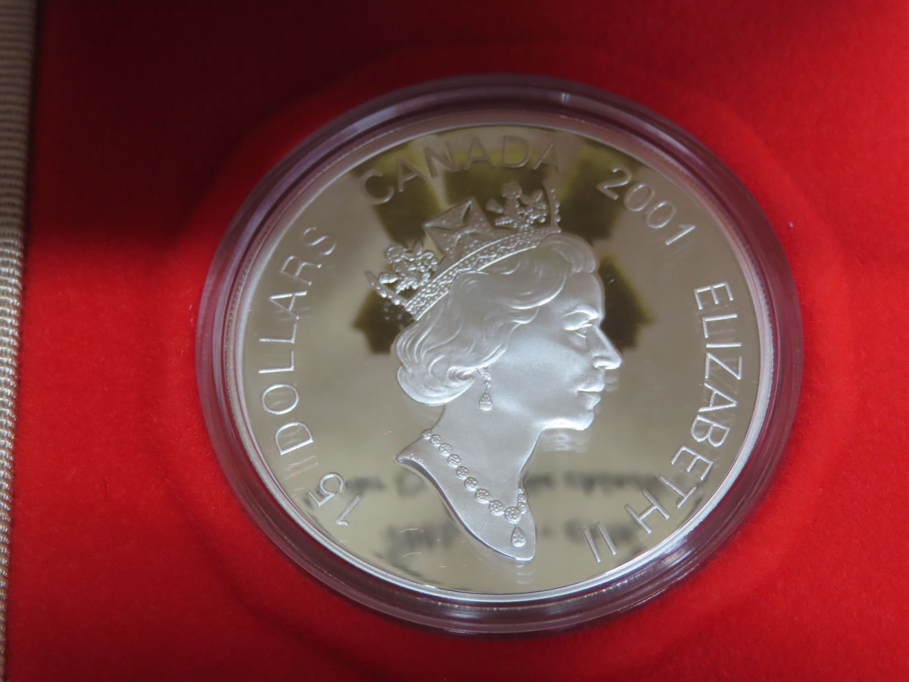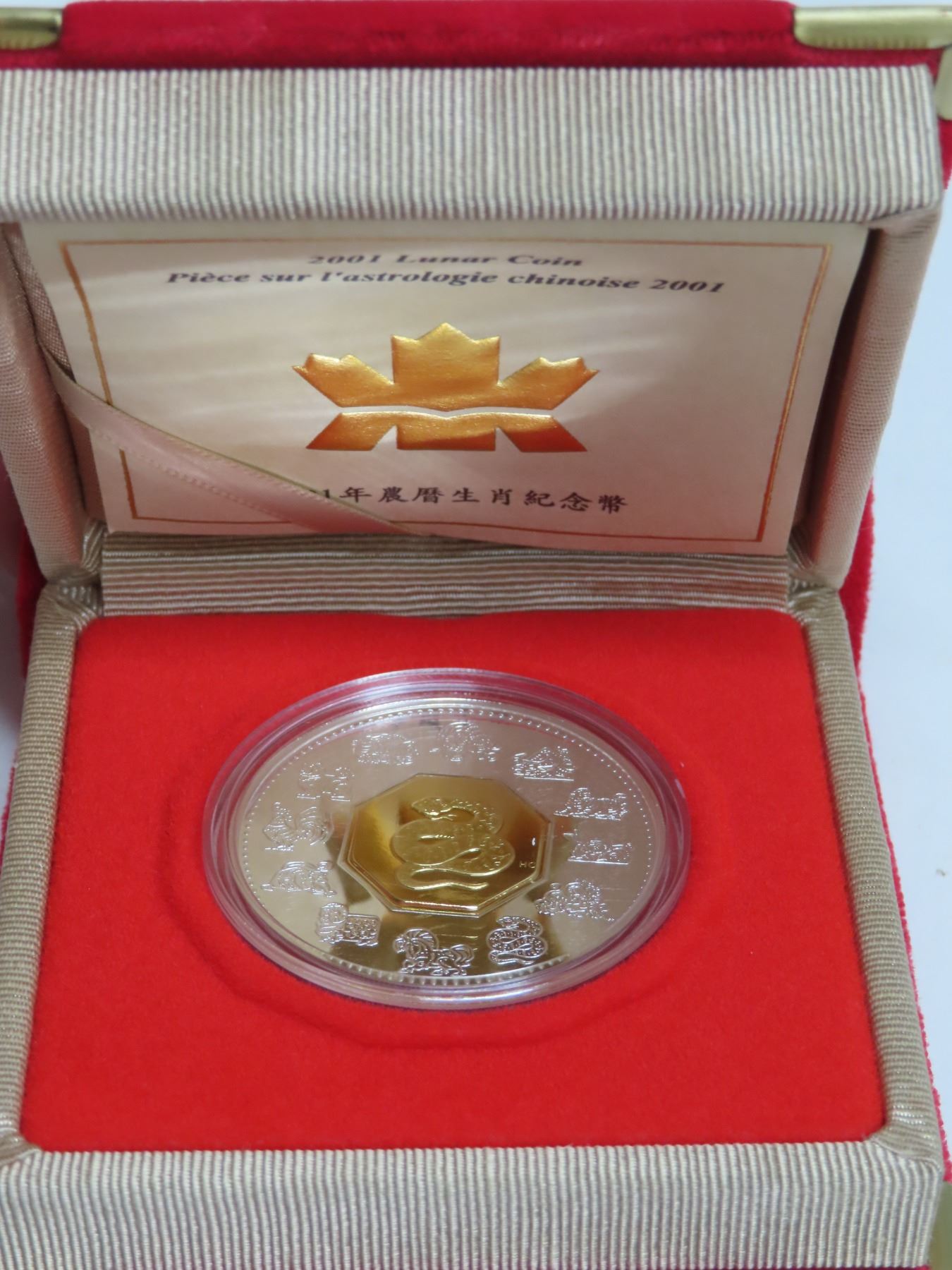 2001 Year of the Snake Lunar $15. Sterling Silver with 24-karat Gold Plating. Proof with Ultra Heavy Cameo. Housed in it original RCM case of issue.