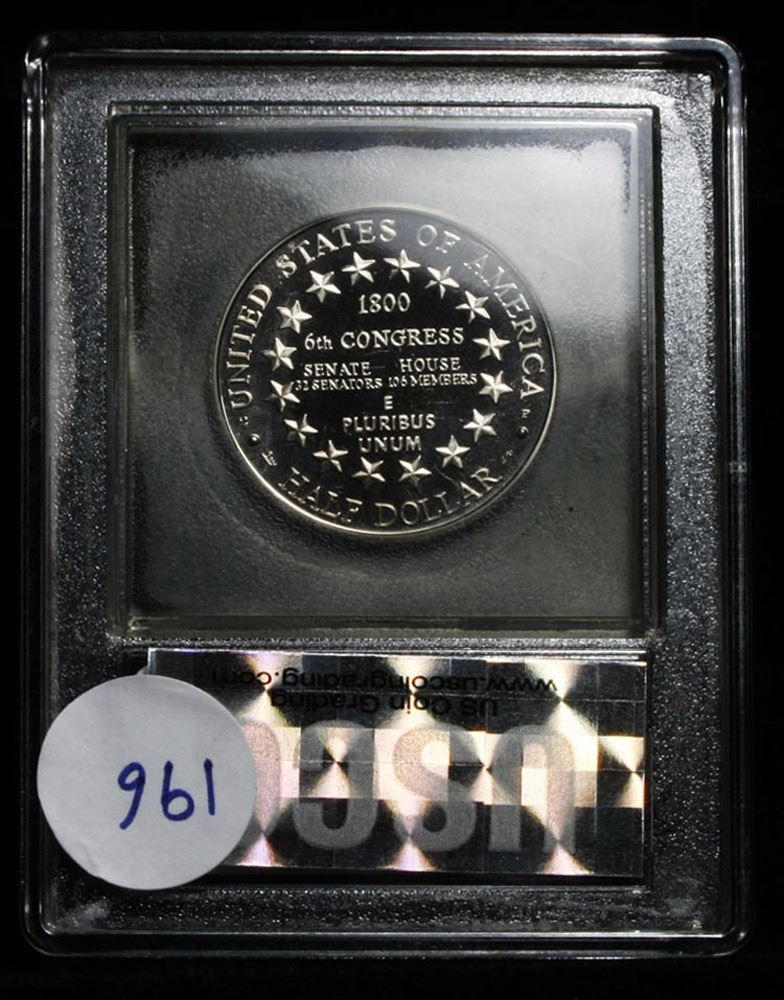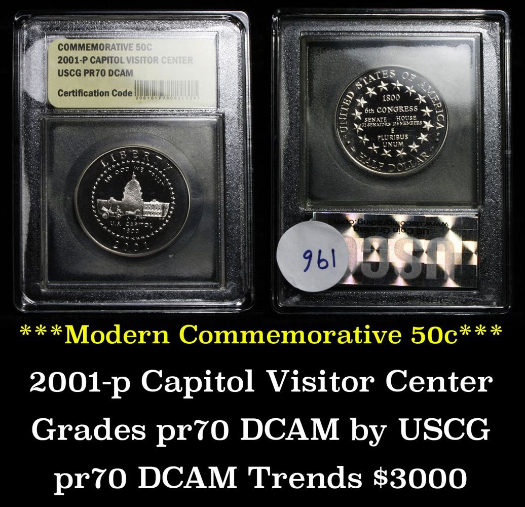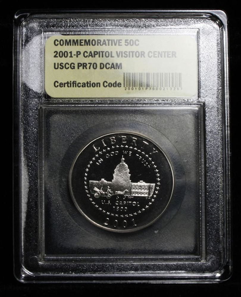 2001-p Capitol Visitor Center Modern Commem Half Dollar 50c Grades GEM++ Proof Deep Cameo. Proof Commem Half Dollar Graded Gem+++ Proof Deep Cameo by USCG. The Commemorative has 16 stars on the reverse representing the 16 states in 1800 and the number of senators and representatives in 1800, very interesting.