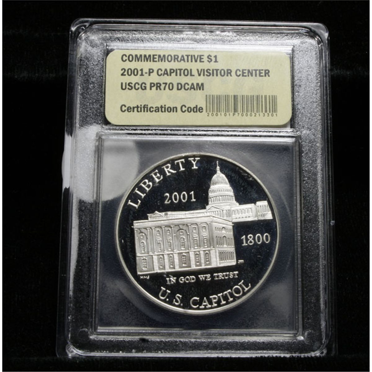 The 2001 Capitol Visitor Center Silver Dollar was issued as part of the commemorative coin program authorized for the proposed Capitol Visitor Center in Washington, DC. The program included three different coins issued in proof and uncirculated versions. This Proof Commemorative Dollar is Graded PR70 Deep Cameo by USCG. PCGS list PR70 DCAM at $1500. Estimated Value $350