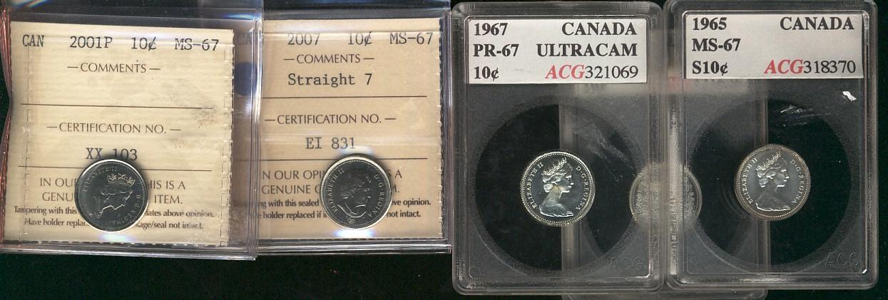 2001P 10¢ & 2007 St7 ICCS MS67 along with 1965, 1967 & 1997 ACG PR67 10¢. Lot of 5 coins.