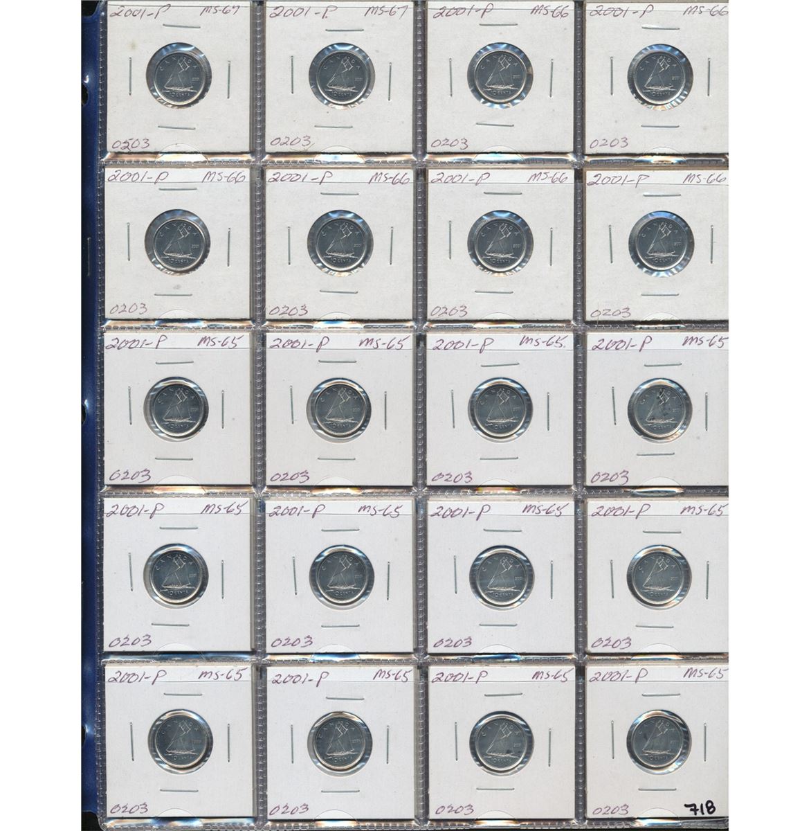 2001P 10¢ BU Roll+; includes 2001P(55) & 2001P Volunteer(18) pieces all in 2x2's. MS63 to MS65 for grades. A nice lot that should be inspected.