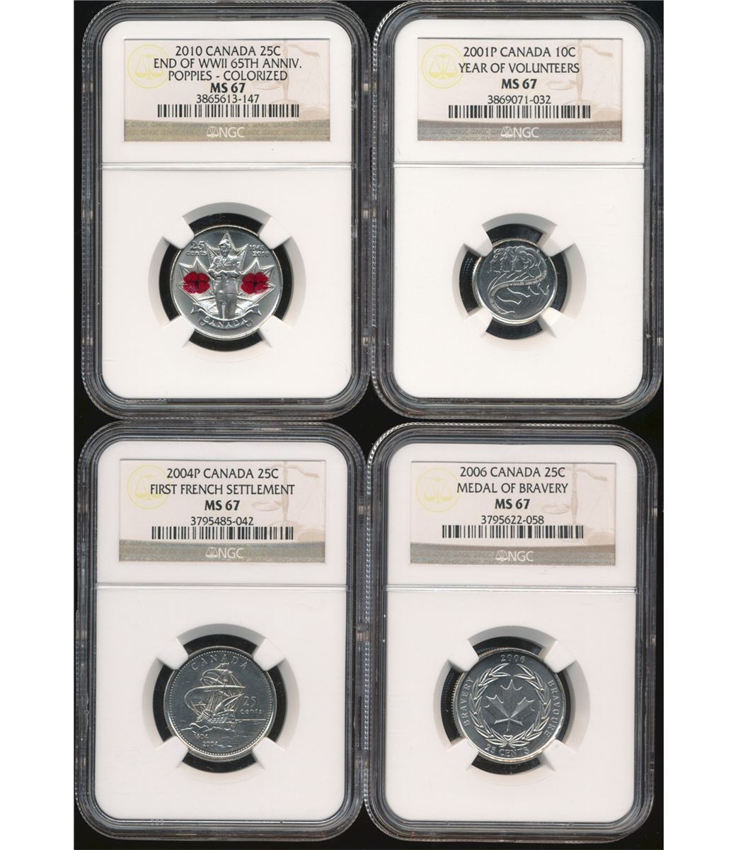 2001P 10¢ Volunteers, 2004P 25¢ French Setllement, 2006 Medal of Bravery & 2010 Colorized Poppies all NGC MS67. Lot of 4 coins.