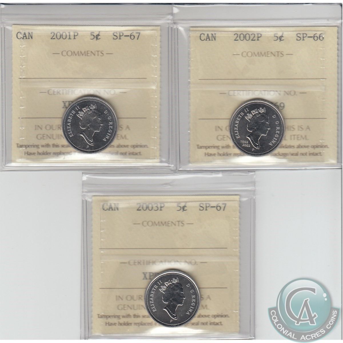 2001P , 2002P and 2003P Canada 5-cent all ICCS Certified coins. this lot includes: 2001P 5c SP-67, 2