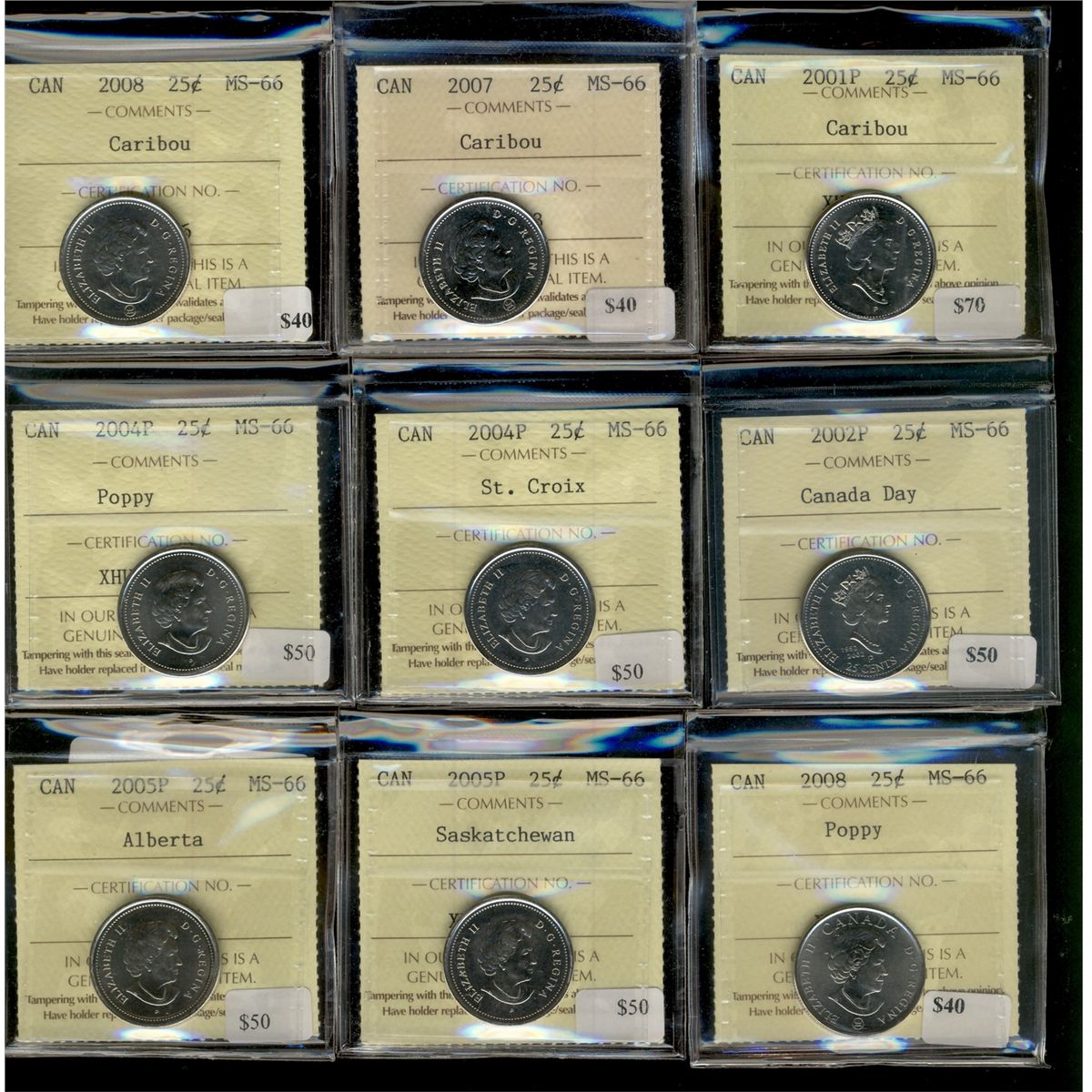 2001P 25¢, 2007, 2008 Caribou issues, 2002P Canada Day, 2004P St Croix, 2004P, 2008 Poppy issues 2005P Saskatchewan & Alberta all ICCS MS66. Lot of 9 coins.