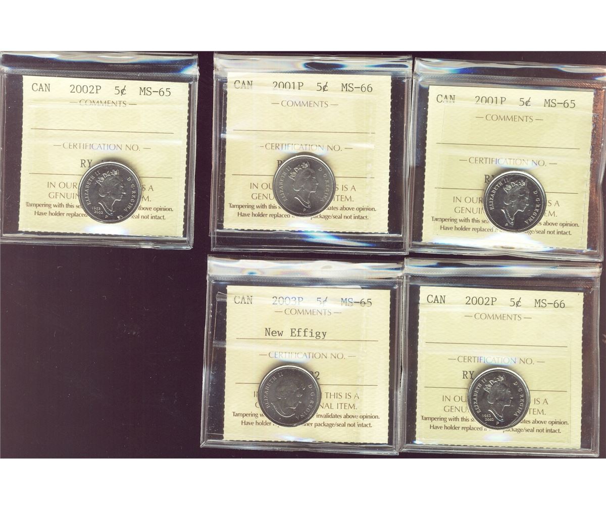 2001P 5¢(2), 2002P(2) & 2003P New Eff ICCS MS65 to MS66. Lot of 5 coins.