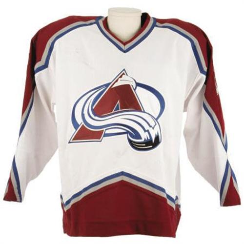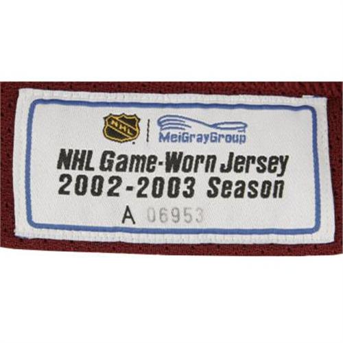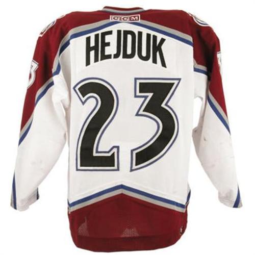 <B>2002-03 Milan Hejduk Game Worn Jersey.</B></I> Important gamer dates to the Czech superstar's finest season, one in which he earned the Maurice "Rocket" Richard Trophy as the NHL's top goalscorer. Fine wear upon his home white Colorado Avalanche jersey is evident within a sizeable collection of stick and board marks decorating the chest and sleeves, suggesting that at least a few of his fifty goals must have been netted in this shirt. Team logo patches are applied to chest and shoulders, with number "23" appearing on each sleeve and verso. Distinctive font spells "Hejduk" across rear nameplate. Manufacturer's "CCM" patch appears on rear collar, with size "56" Canadian flag tag inside collar. Fight strap is in place in rear tail. Unbeatable provenance is provided by "MeiGray Group" authentication, the marketing company with exclusive ties to the Colorado Avalanche franchise. Their authenticating patch is applied to inner tail hem, with matching serialized paperwork included. A top specimen from this young superstar. <I>LOA from MeiGray Group.</B></I><BR><BR><b>Shipping:</b> Clothing, Costumes & Jerseys (<a target="_blank" href="http://www.heritageauctions.com/common/shipping.php">view shipping information</a>)
