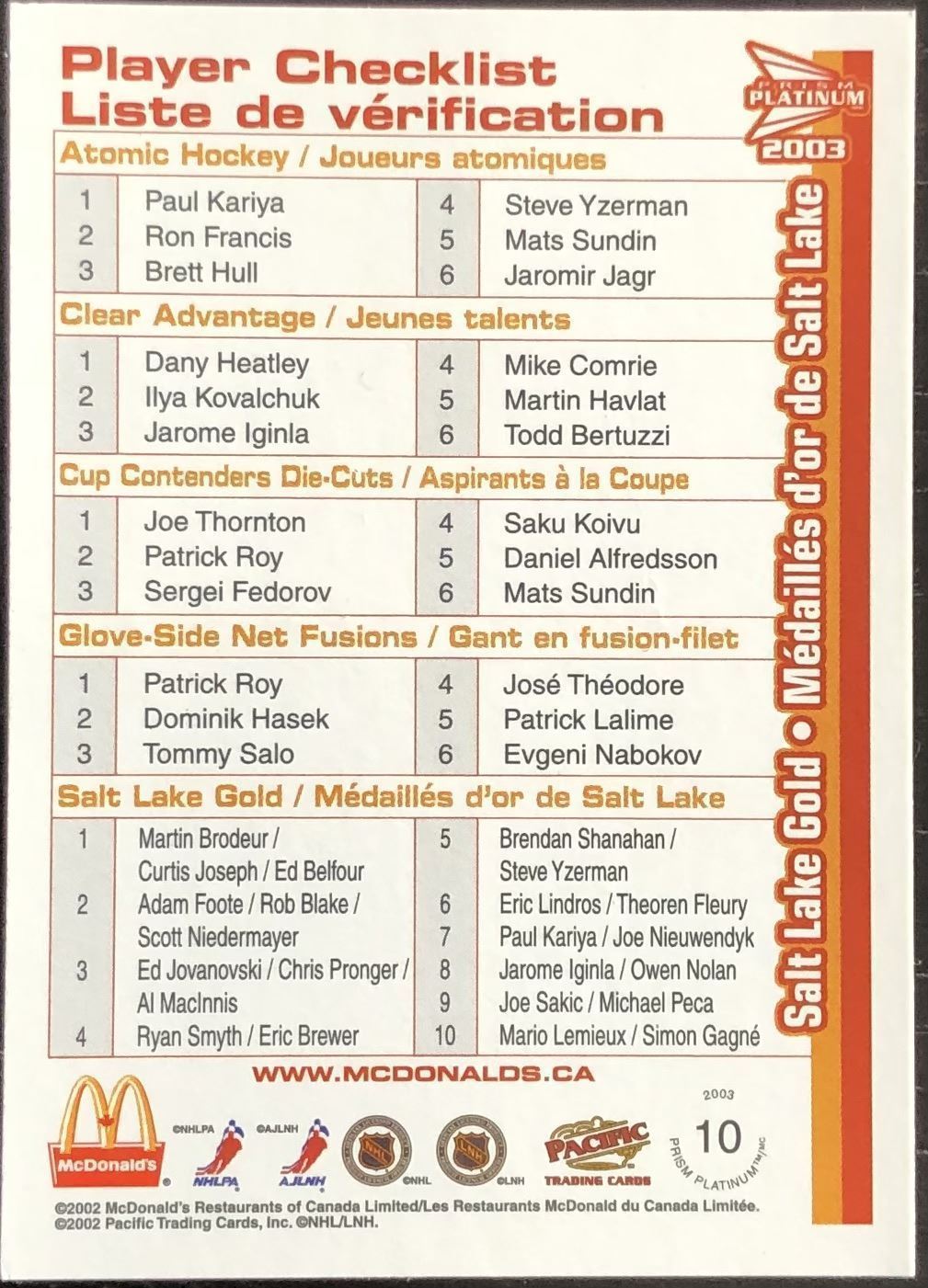McDonald's card #10 NHL, hockey, hall of fame, regional