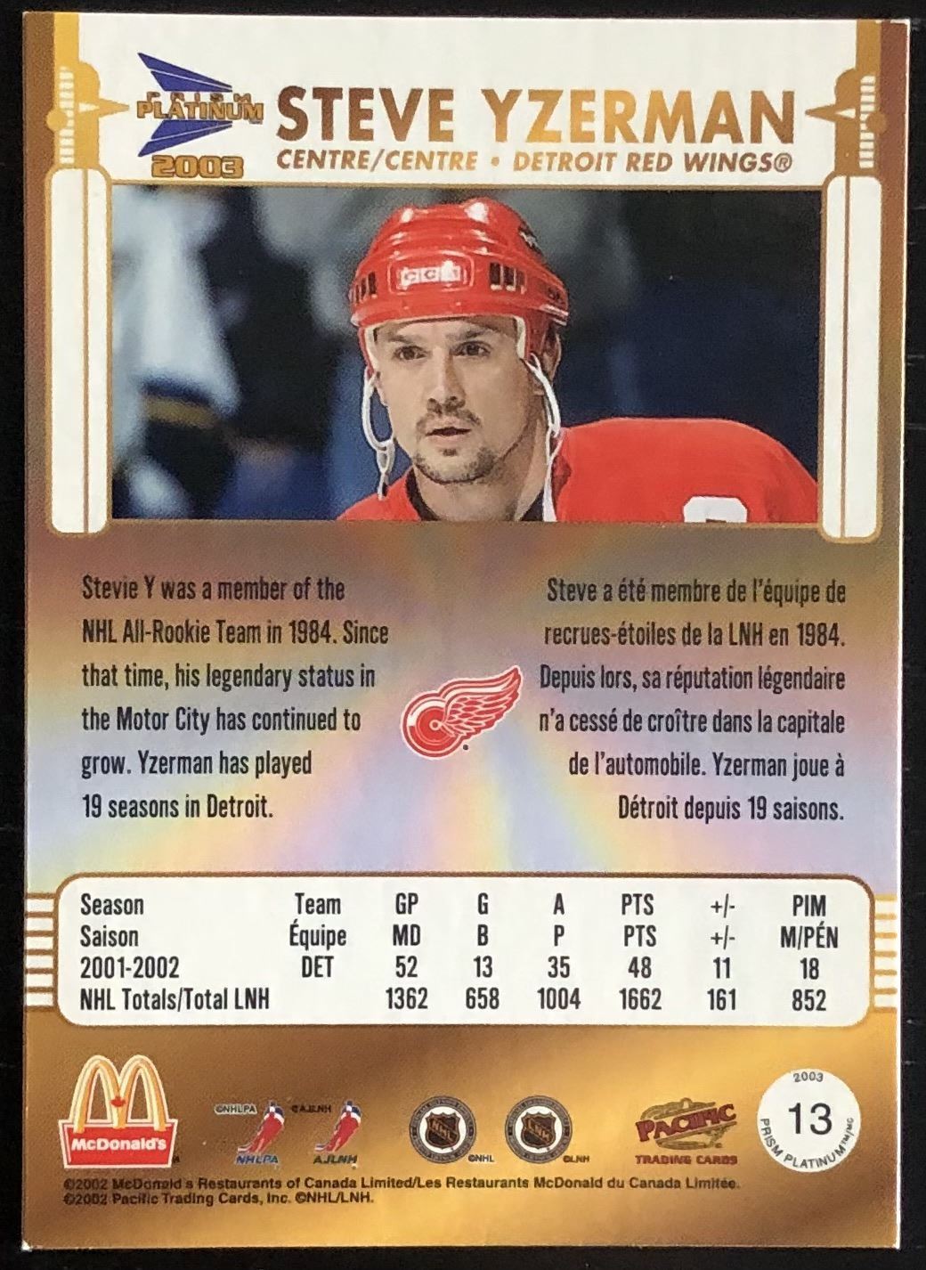 McDonald's card #13 NHL, hockey, hall of fame, regional